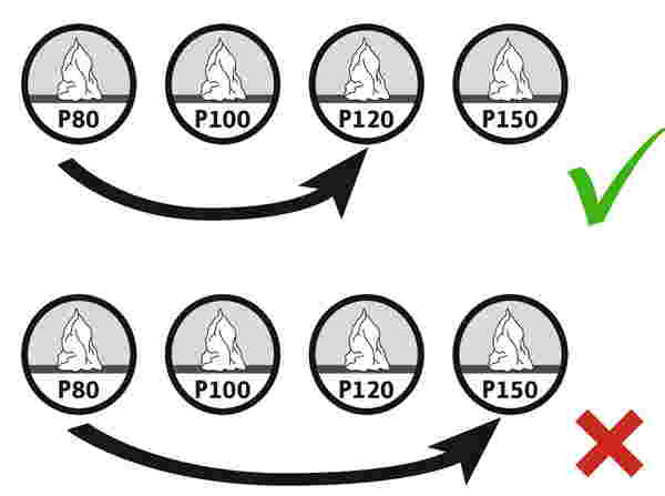 Porque al saltarse un grano, por ejemplo, del 80 al 240, se conserva la estructura básica del material. El grano 240 solo lija las puntas, pero no llega a los valles existentes. El resultado: una estructura superficial rugosa, ondulada y desigual.